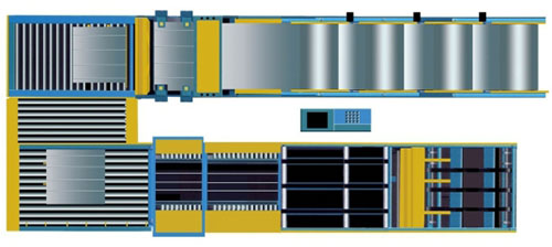風(fēng)管生產(chǎn)6線是通風(fēng)管道加工的專用機(jī)械。該機(jī)器是由料架,自動分料器,調(diào)平機(jī)、剪板機(jī)、剪角機(jī)、壓筋機(jī)、1號送料平臺、雙聯(lián)東洋骨機(jī)、2號送料平臺、共板法蘭雙聯(lián)機(jī)、數(shù)控送料小車和個自動折彎機(jī)等機(jī)器組合而成的。電器控制部分采用全計算機(jī)PLC控制,該系統(tǒng)具有死循環(huán)反饋功能,生產(chǎn)精度和穩(wěn)定性高。所生產(chǎn)的風(fēng)管外形平整美觀,尺寸標(biāo)準(zhǔn)。裝配時工作輕松快捷,效率高;安裝后的風(fēng)管外形美觀,線條流暢,22秒出一根風(fēng)管,極大的提高了用戶的加工效率。
